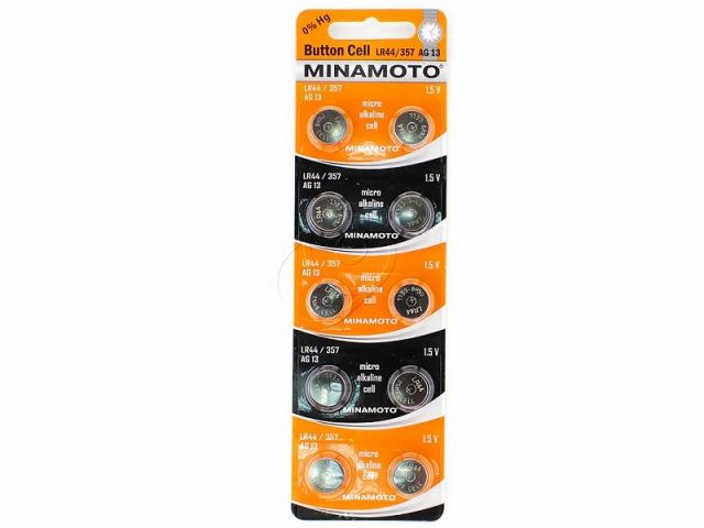 Батарейка MINAMOTO AG13 для калькуляторов, часов, лазерных указок и др. техники. Комплект - 10 штуки. Совместимые модели: 357 A76 AG13 G13 L1154 LR44