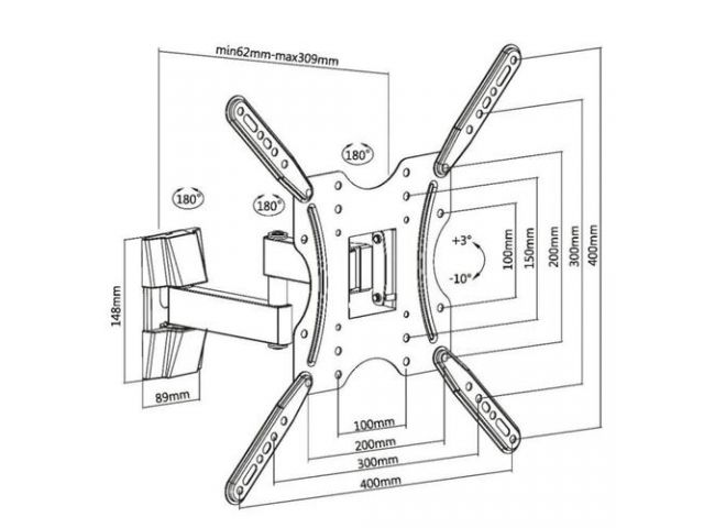 Крепление монитора или телевизора к стенеVESA 100 x 100, VESA 200 x 100, VESA 200 x 200, VESA 300 x 200, VESA 300 x 300, VESA 400 x 200, VESA 400 x 400,