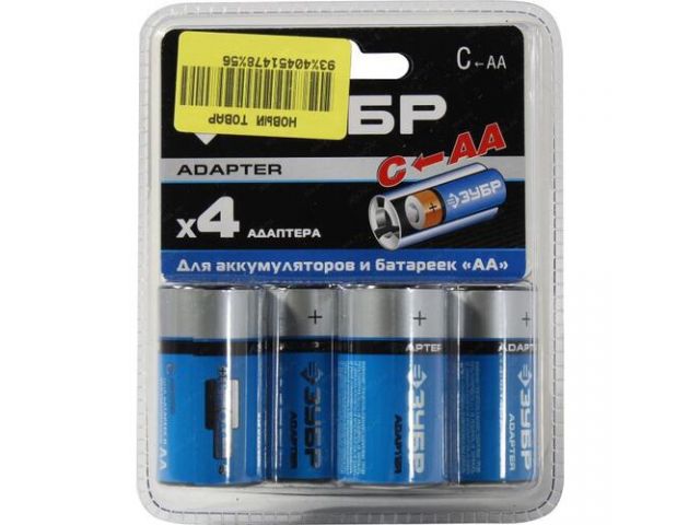 Зубр 59278-4C представляет собой переходник, позволяющий использовать стандартные батарейки типа АА и никель-металлогидридные аккумуляторы вместо элементов питания типа С. В упаковке 4 адаптера