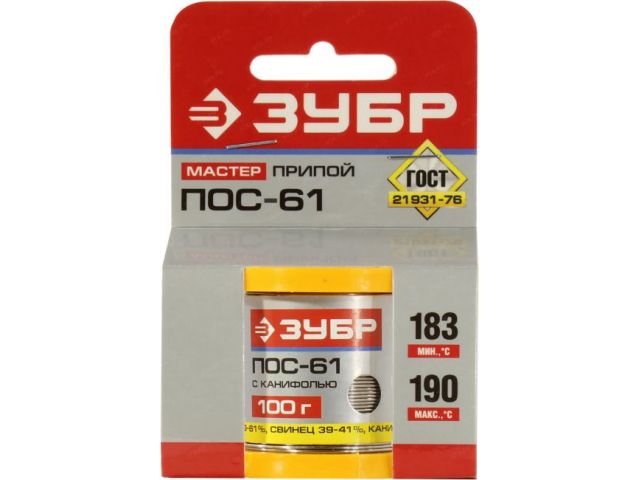 | Припой ПОС 61 Зубр применяется для лужения и пайки элементов электро- и радиоаппаратуры, печатных схем, точных приборов с герметичными швами, где недопустим перегрев, пайка жести, обмоток электрических машин, монтажных элементов, моточных и кабельных изделий, радиаторов и листового цинка, оцинкованных деталей холодильных агрегатов, теплообменников, электроламп, кабельных оболочек, тонколистовой упаковки. |