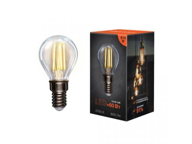 Филаментная лампа в форме шарика выступает как в качестве источника искусственного освещения, так и элемента декора. Благодаря компактным размерам лампы данного типа зачастую устанавливаются в небольшие люстры, настенные бра, маленькие настольные лампы или в другие осветительные приборы, для которых стандартная лампа слишком мала (выступает из-за плафона или не помещаться вовсе). За счет распространения света во всех направлениях потребляет меньше электроэнергии при более высокой яркости. Также лампа равномерно распределяет температуру, благодаря чему не нагревается. Обладает мощностью в 7,5Вт и цоколем Е14.