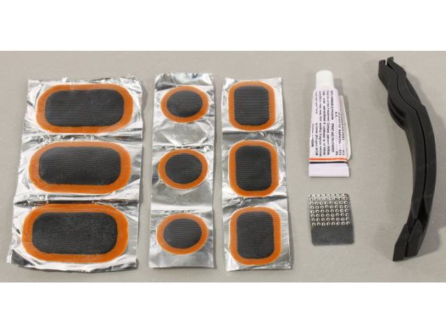 Набор для обслуживания велосипеда включает мультитул, состоящий из отверток и ключей, а также комплект для ремонта камер.