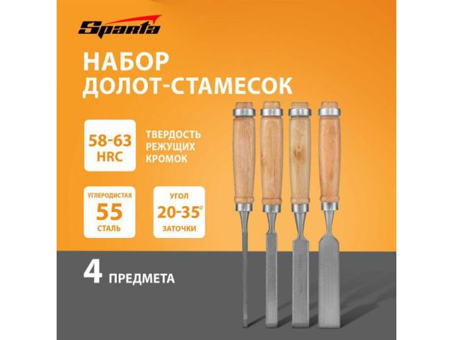 SPARTA Набор долот-стамесок, 6-12-18-24 мм, плоских, деревянные рукоятки 242405