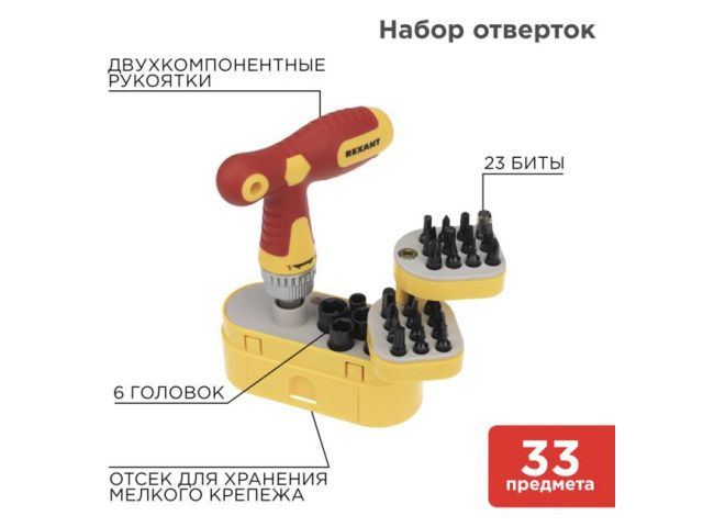 Набор отверток REXANT 33 в 1 применяется для монтажа и демонтажа винтов, шурупов, саморезов и других крепежных изделий. Биты выполнены из качественной хромованадиевой стали. Т-образная отвертка 2 в 1 оснащена реверсивным механизмом (реверс по часовой стрелке/против часовой стрелки/фиксация), а также стандартным отверстием под насадки для создания классического инструмента. В основании есть отверстие, которое может использоваться для создания дополнительного рычага усилия при работе, если установить в него металлический пруток. Двухкомпонентная рукоятка оснащена магнитным держателем, что обеспечивает быструю замену и надежную фиксацию бит. Для удобства хранения и транспортировки набор поставляется в органайзере, который оснащен отсеком для хранения мелкого крепежа. Комплектация:; Шестигранная звезда: T5, T6, T10, T15, T20, T25, T30; Шестигранник: H3, H4, H5, H6; Крестовая: PZ2, PZ3; Крестовая: PH0, PH1, PH2; Шлицевая: SL3, SL5, SL6; Tri-Wing (трехлистник): Y2, Y3; Треугольный шлиц: 2.3; U6.0; Головки: M6, M7, M8, M9, M10, M11; Жесткий удлинитель; Гибкий удлинитель; Адаптер