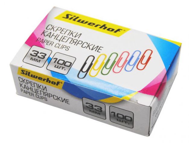 Скрепки Silwerhof 492021 металл пластиковая оболочка 33мм ассорти (упак.:100шт) картонная коробка