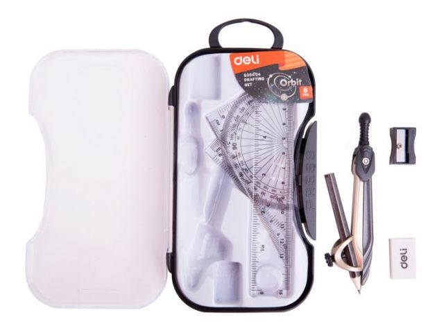 Циркуль Deli EG30404 корпус ассорти металл в компл.:линейка/транспортир/2 угольника/карандаш/ластик/точилка
