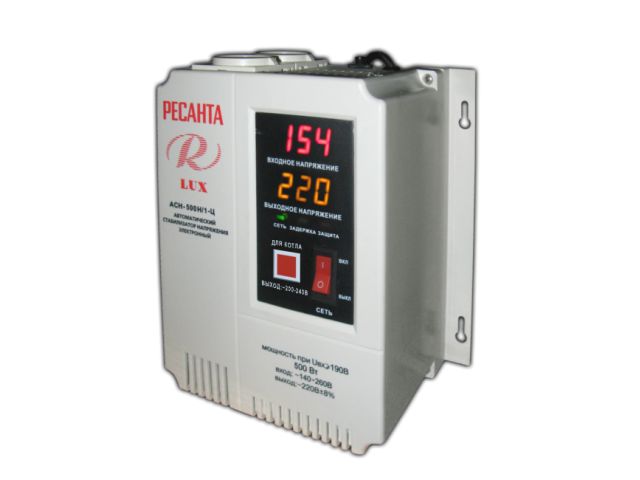 Стабилизатор серии LUX РЕСАНТА АСН-500 Н/1-Ц - однофазный релейный стабилизатор для размещения на стене. Устройство выравнивает входящее напряжение и защищает электрические приборы от высоких скачков напряжения с суммарной мощностью до 0.5 кВт. Благодаря металлическому корпусу внутренние узлы защищены от механических повреждений. Стабилизатор Ресанта оснащен цифровым дисплеем, показывающим основные параметры работы. Для более эффективного охлаждения в конструкции прибора предусмотрен вентилятор. С помощью функции «Байпас» можно выключить устройство и подключить нагрузку в обход стабилизатора к питающей сети одним нажатием кнопки. Преимущества: Аварийное отключение нагрузки при превышении максимальных показателей напряжения. Контроль входного и выходного напряжения. Термозащита. Небольшие размеры. Фильтрация сетевых помех на входе и выходе. Функция «Байпас». *Режим Котёл Отключает подачу питания на котёл при выходном напряжении ниже 200В