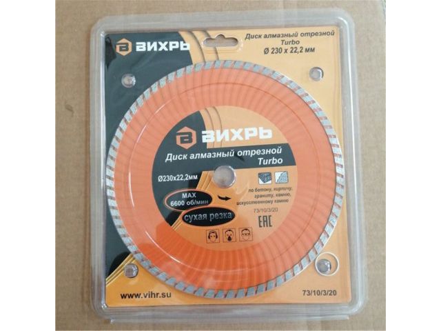 Диск алмазный отрезной Турбо 230 х 22,2 мм, сухая резка Вихрь - это алмазный отрезной диск, который используется совместно с угловыми шлифмашинами (болгарками) для сухой резки гранитных, бетонных, кирпичных и каменных изделий. Особенности: • Волнообразная форма металлического основания является наиболее удачной и способствует максимально быстрому удалению продуктов пиления, улучшенному охлаждению и снижению нагрузки на УШМ. • Турбированная форма, обеспечивает плавное безударное резание, с эффективным охлаждением. • Продолжительный ресурс работы обеспечивается высокой концентрацией алмазного порошка в оптимально подобранной связке. • Предназначены для резки «сухим методом» изделий из твердых материалов: армированного бетона, железобетона, камня, мрамора, шлакоблоков, гранита и пр.