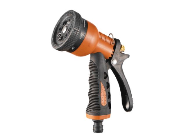Пистолет-распылитель, 8 режимов полива эргономичная прорезиненная рукоятка, регулировка напора воды металлическая.