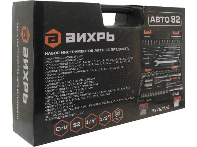 | Тип инструмента в наборе | Адаптер для бит (квадрат 1/2 F - шестигранник 5/16 F), Биты под квадрат 1/4 (биты-насадки), Вороток Т-образный для торцевых головок 1/2 , Вороток Т-образный для торцевых головок 1/4 , Вставки (биты) 5/16 , Гибкий удлинитель для бит (шестигранник 1/4 M - F), Кардан (квадрат 1/2 M - F), Кардан (квадрат 1/4 M - F), Ключ трещотка для торцевых головок 1/2 , Ключ трещотка для торцевых головок 1/4 , Комбинированный гаечный ключ, Отвертка-вороток для торцевых головок (квадрат 1/4 M), Переходник для торцевых головок (квадрат 3/8 F - квадрат 1/2 M), Торцевые головки 1/2 , Торцевые головки 1/4 , Удлинитель для торцевых головок (квадрат 1/2 M - F), Удлинитель для торцевых головок (квадрат 1/4 M - F) |