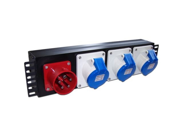 Для подключения нагрузки блок оснащен тремя выходными розетками международного стандарта IEC 309. Этот тип соединения широко распространен в профессиональной сфере и известен своей надежностью, безопасностью и устойчивостью к частым подключениям и отключениям. Вход устройства выполнен в виде разъема того же стандарта - IEC 60309, что обеспечивает совместимость с существующей инфраструктурой и силовыми линиями. Важно отметить, что для завершения монтажа потребуется отдельно приобрести силовой кабель необходимой длины, так как блок поставляется без кабеля питания в комплекте, предоставляя специалистам свободу выбора в зависимости от конкретных условий установки.