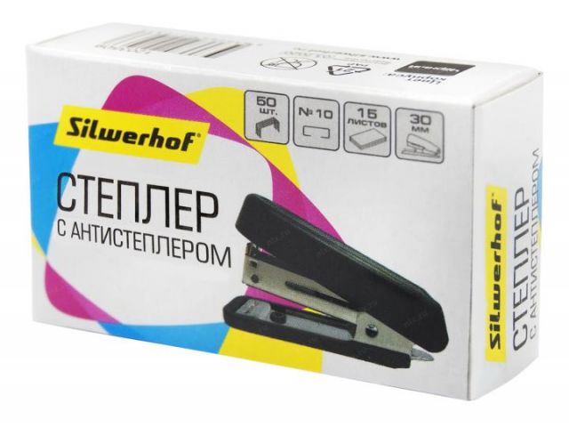 Степлер мини Silwerhof N10 (15листов) встроенный антистеплер черный 50скоб пластик закрытый коробка