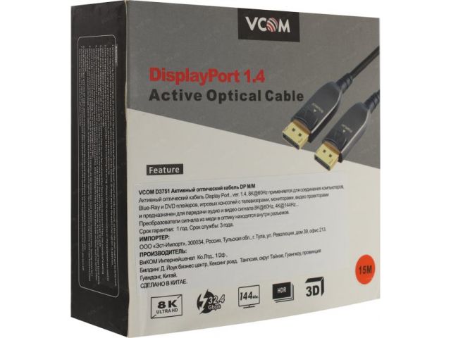 | Высокоскоростной активный оптический кабель DisplayPort версии 1.4 применяется для соединения компьютеров, Blue-Ray и DVD плейеров, игровых консолей, видео и фото камер с телевизорами, мониторами, видео проекторами и предназначен для передачи аудио и видео сигнала