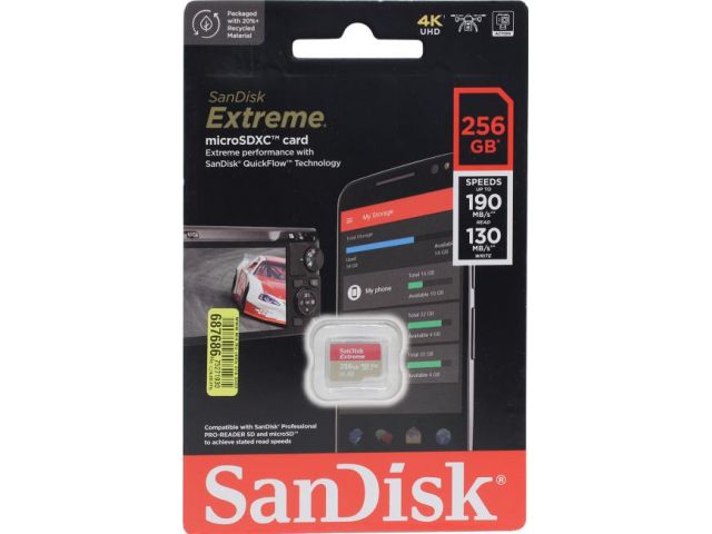 Карта памяти SanDisk Extreme SDSQXAV-256G-GN6MN microSDXC A2, V30, UHS-I Class 3 (U3) 256 ГБ