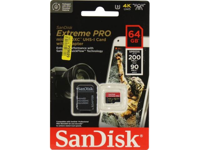 Карта памяти SanDisk Extreme Pro microSD UHS I Card 64GB for 4K Video on Smartphones, Action Cams & Drones 200MB/s Read, 90MB/s Write, Lifetime Warranty