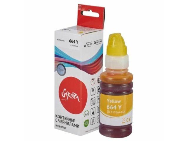 Контейнер с чернилами Sakura C13T66444A (664 Y) для Epson L485/L385/L380/L361/L605/L1455/L100/L101/L110/L111/L120/L130/L200/L201/L210/L211/L220/L300/L301/L303/L310/L313/L350/L351/L353/L355/L358/L360/L363/L365/L455/L550/L551/L555/L558/L565/L1300/L386/L382/L364/L486;EcoTank Expression ET-2500/2550/4500/14000/2650/2600/3600/4550, желтый, водорастворимый тип, 70 мл., 6500 к.