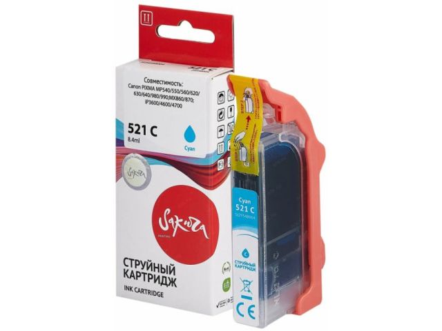 Струйный картридж Sakura 2934B004 (521 C) для Canon PIXMA MP540/550/560/620/630/640/980/990;MX860/870;iP3600/4600/4700, водорастворимый тип чернил, голубой, 8,4 мл., 530 к.