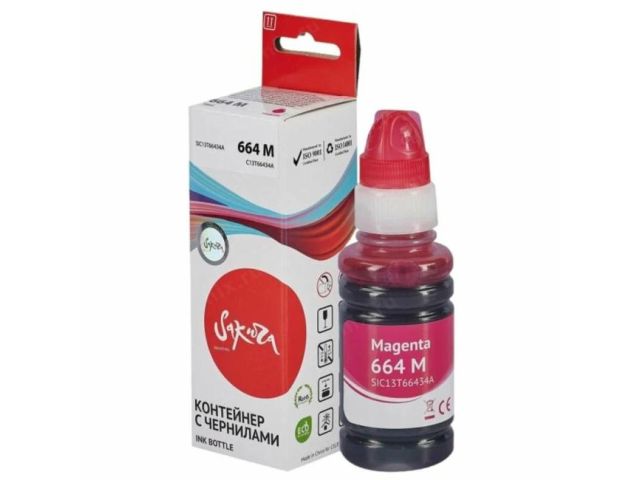 Контейнер с чернилами Sakura C13T66434A (664 M) для Epson L485/L385/L380/L361/L605/L1455/L100/L101/L110/L111/L120/L130/L200/L201/L210/L211/L220/L300/L301/L303/L310/L313/L350/L351/L353/L355/L358/L360/L363/L365/L455/L550/L551/L555/L558/L565/L1300/L386/L382/L364/L486;EcoTank Expression ET-2500/2550/4500/14000/2650/2600/3600/4550, пурпурный, водорастворимый тип, 70 мл., 6500 к.
