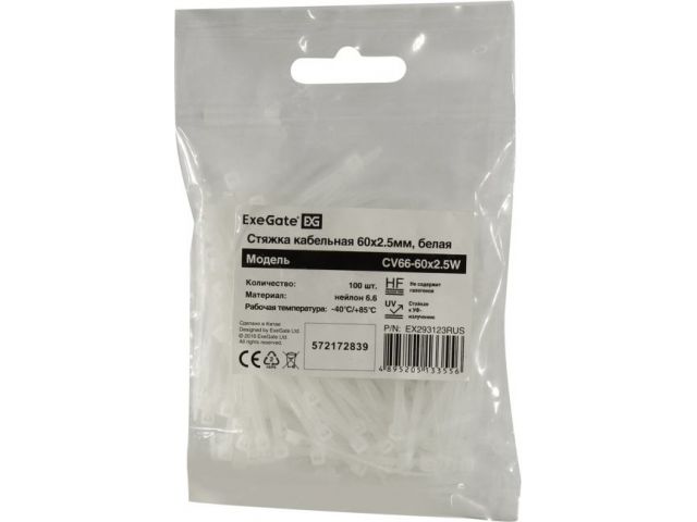 Exegate CV66-60x2.5W Стяжка нейлоновая, неоткрыв. белая, 60 мм, уп-ка 100 шт EX293123RUS