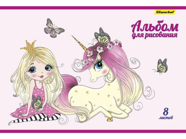 Альбом для рисования Silwerhof 485718 8л. A4 Единороги 2диз. картон скрепка