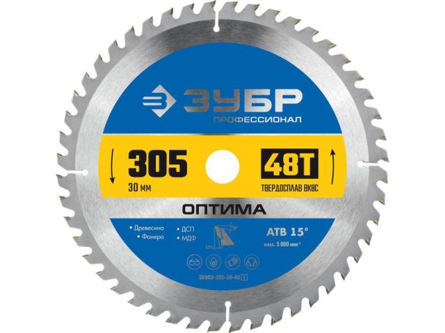 Пильный диск по дереву ЗУБР 36903-305-30-48_z01, предназначен для продольных и поперечных пропилов твердой и мягкой древесины, обшивочных необработанных досок, неламинированной ДСП, строительного бруса и строительной древесины с остатками краски.