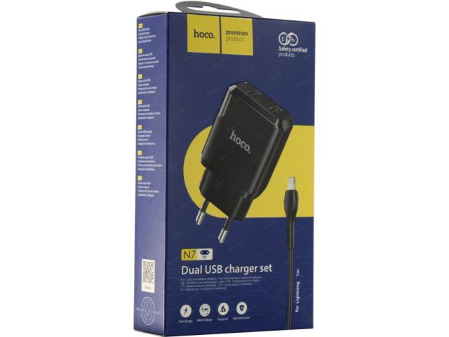 Hoco N7 Зарядное устройство USB (Вх. AC100-240V, Вых. DC5V, 2xUSB, кабель Lightning)