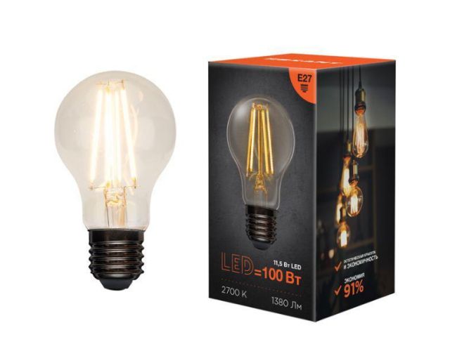 604-076 Лампа филаментная Груша A60 11,5Вт 1380Лм 2700K E27 прозрачная колба REXANT