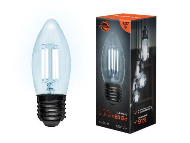 604-090 Лампа филаментная Свеча CN35 7,5Вт 600Лм 4000K E27 диммируемая, прозрачная колба REXANT