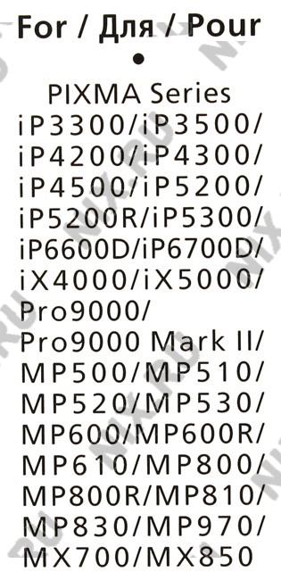 СовместимостьCanon iP4200, iP5200, MP500, MP800, iP3300, iP4300, iP5300, MP800, MP830, MP530, MP510, MP600, MP810, MP520, MP470, MX850, MX700, iX5000, iX4000, iP6600D, iP6700D, MP970, iP3500, Canon Pixma Pro9000, Pro9000 Mark II