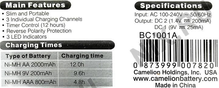 Время зарядки9 часов для Ni-MH аккумуляторов размера АА емкостью 1500 мА·ч, 9.6 часов для Ni-MH аккумуляторов размера 9V емкостью 200 мА·ч