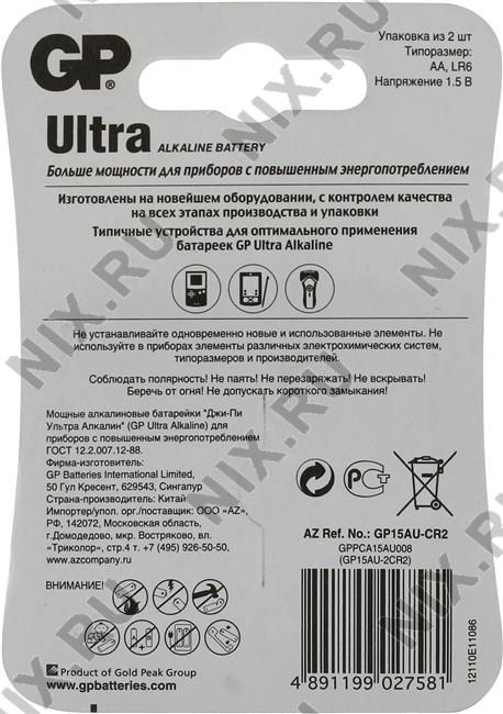 • GP Ultra 15AU(EBC)-CR2/15AUA21-2CRSBC2 (LR6) Size AA, щелочной (alkaline) уп. 2 шт