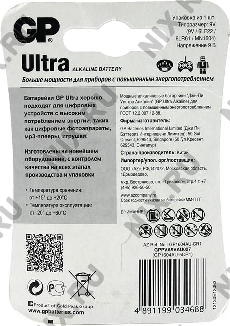 GP Ultra/Super 1604AU/1604A-CR1/1604AA21 (6LR61) 9V, щелочной (alkaline), типа Крона