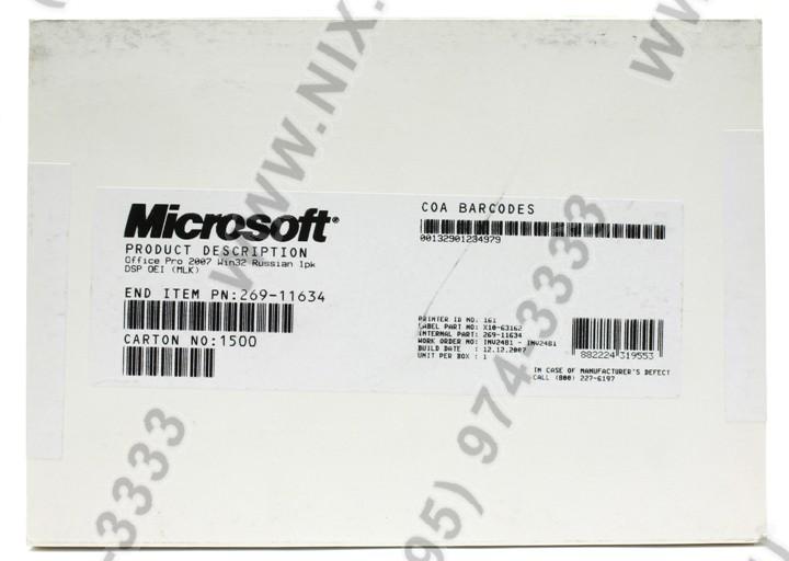 | Лицензионный ключ для активации Microsoft Office 2007. При помощи данного ключа можно активировать предустановленную на ПК ознакомительную версию Microsoft Office 2007 (в течение 90 дней со дня покупки). Также возможно приобретение ключа активации непосредственно при покупке любого компьютера NIX с Windows.При покупке ключа активации для пробного Microsoft Office , установленного на новый компьютер, Вы экономите до 30% стоимости по сравнению с аналогичным продуктом Microsoft Office , приобретаемым отдельно (BOX версии). |