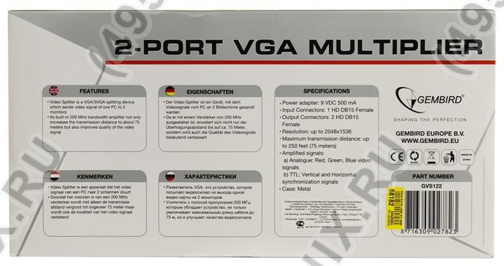 Gembird/Cablexpert GVS-122  2-Port Video Splitter (VGA15F+2xVGA15F)+б.п.