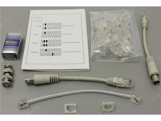 Комплект поставки20 коннекторов RJ-11, 20 коннекторов RJ-45, LAN тестер, Батарейка типа Крона , Инструмент для заделки контактов типа Krone, Инструмент для резки, зачистки и обжима кабелей RJ-45, RJ-12, RJ-11, переходники для тестирования BNC кабеля, Тестовые патч-корды RJ-45/12, Универсальный зачистной нож, Чехол